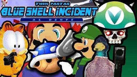 The film then cuts to a flashback of the supposed Blue Shell Incident, which features Mario and Luigi walking through an amusement park. Lasagna Ocelot, the alter ego of Garfield, stalks the duo and contacts a mysterious figure that "Operation Blue Shell Kill" is about to commence. He attempts to assassinate Luigi with his gun just as Mario ominously informs Luigi that he will go to hell before he dies. However, due to Lasagna Ocelot's laziness and it being a Monday, Lasagna misses the shot and it hits Mario instead. The cat retreats via a helicopter, seemingly out of ammo and is seemingly blown up by colliding into a random Toad in the sky. Luigi, upset over his brother's death, screams so loudly it can be heard in space.
